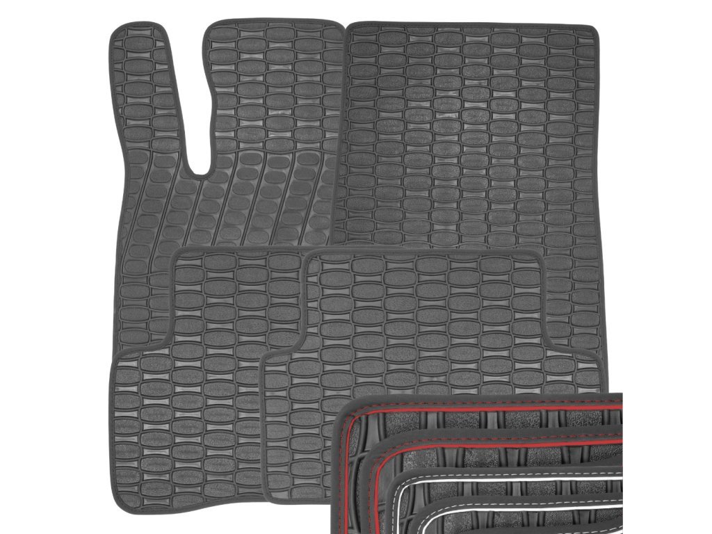 Podlahové rohože jsou vyrobeny ze 100% gumy + koženkové lemovky.